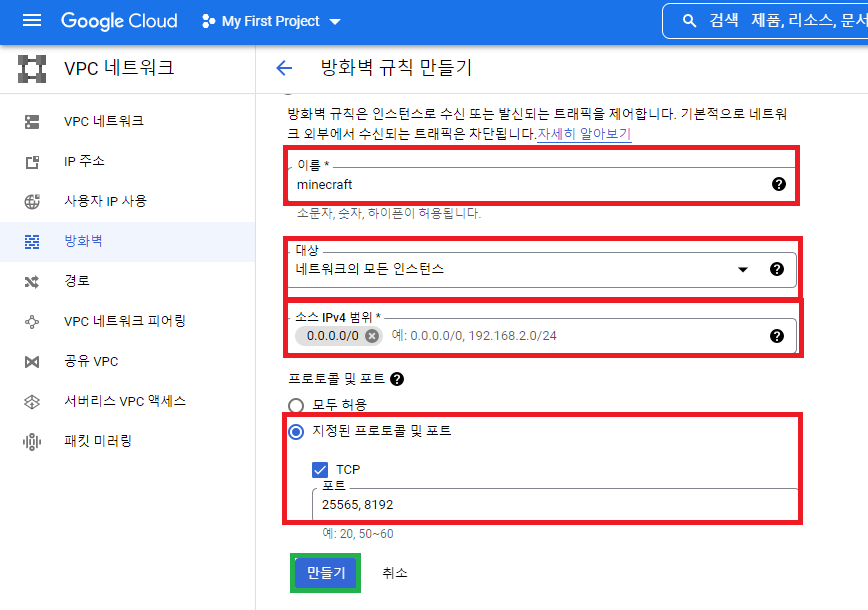 TCP UDP (포트포워딩 하려는 종류 체크)